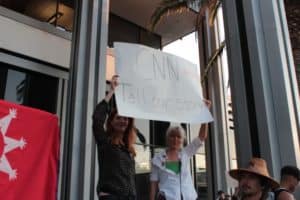 One of the actions was a rally that brought about 100 people together in front of the CNN building in Los Angeles. The event opened with a welcome from Tongva elder Gloria Arellanes and was MC’d by KPFK’s American Indian Airwaves talk radio host Larry Smith (Lumbee). Featured speakers included Cody Hall, spokesperson for the Red Warrior Camp and “Magnificent Seven” actor Martin Sensmeier.