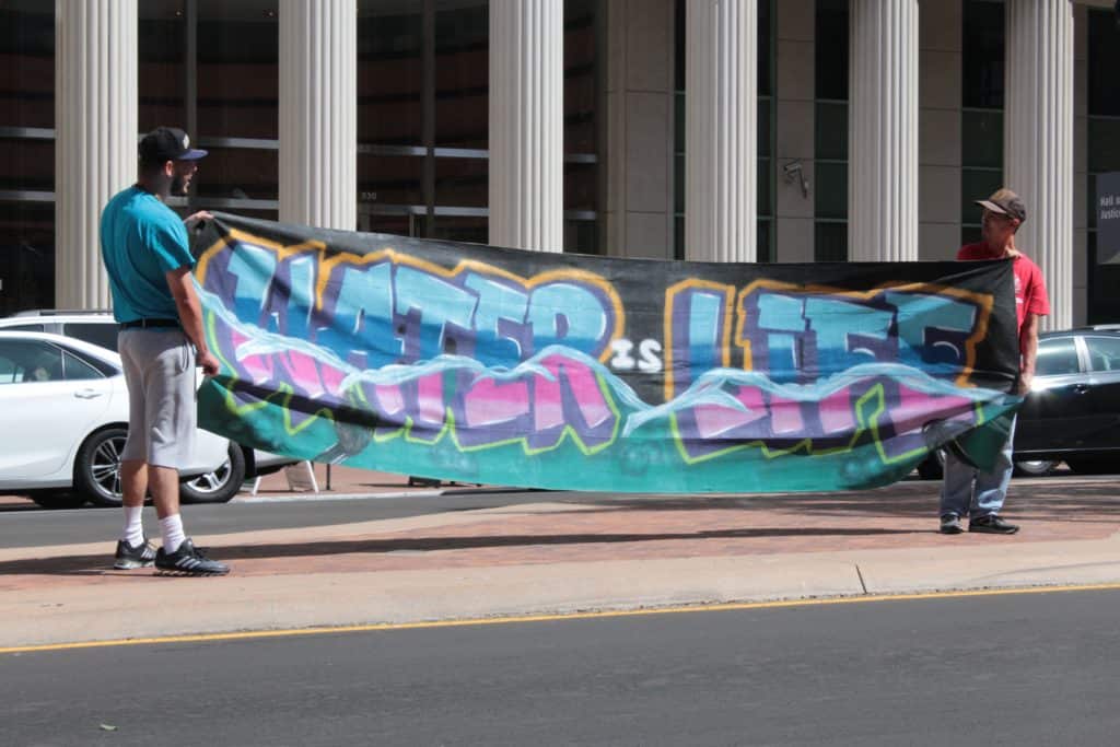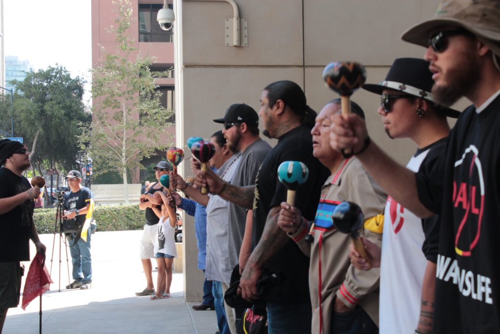 In downtown San Diego, a demonstration in early September at the federal courthouse brought together about 150 people from the local tribes as well as others from across the country to voice their concerns against the pipeline. Singers and dancers from Kumeyaay, Desert Cahuilla, Cupeño, and other communities shared bird songs. There was also hand drumming and Aztec dancing. Bobby Wallace from the Barona Band of Mission Indians Reservation hosted speakers including Sylvia Sherbert (Iipay Nation of Santa Ysabel), Deedee Ybarra (Rumsen Ohlone), and Harry Paul Cuero Jr. (Campo Kumeyaay Nation).