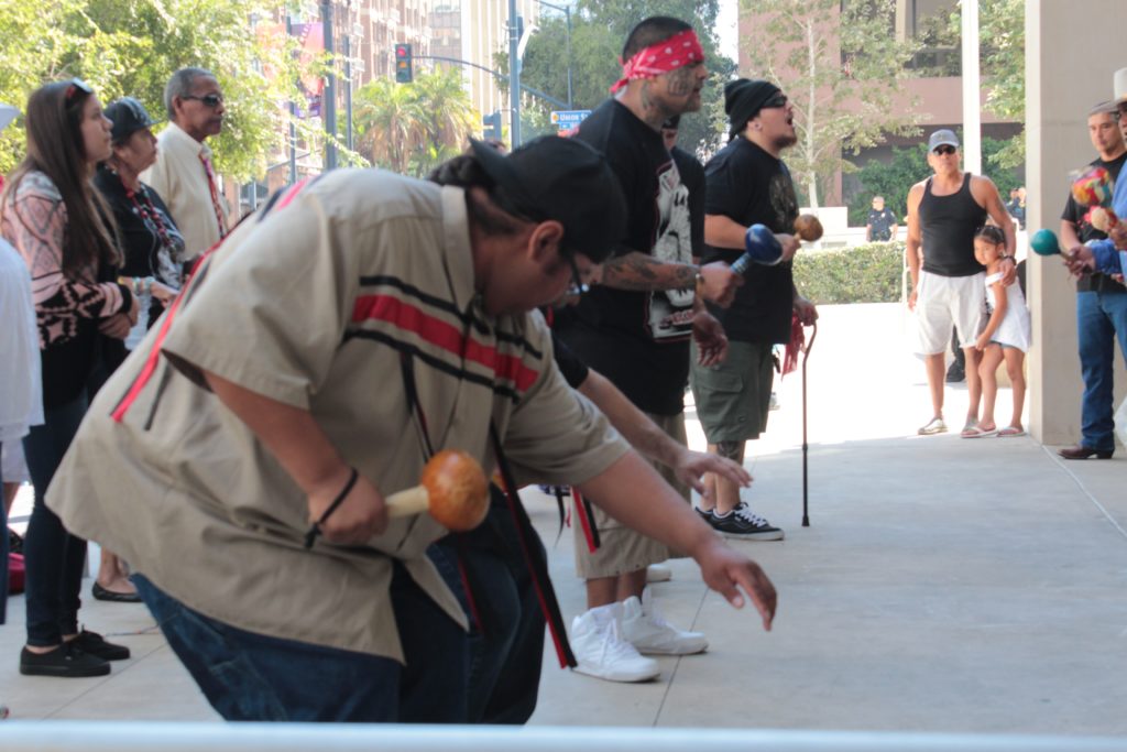 Harry Paul Cuero Jr. (Campo Kumeyaay Nation) speaking in downtown San Diego at the federal courthouse during a Unity with Standing Rock event.