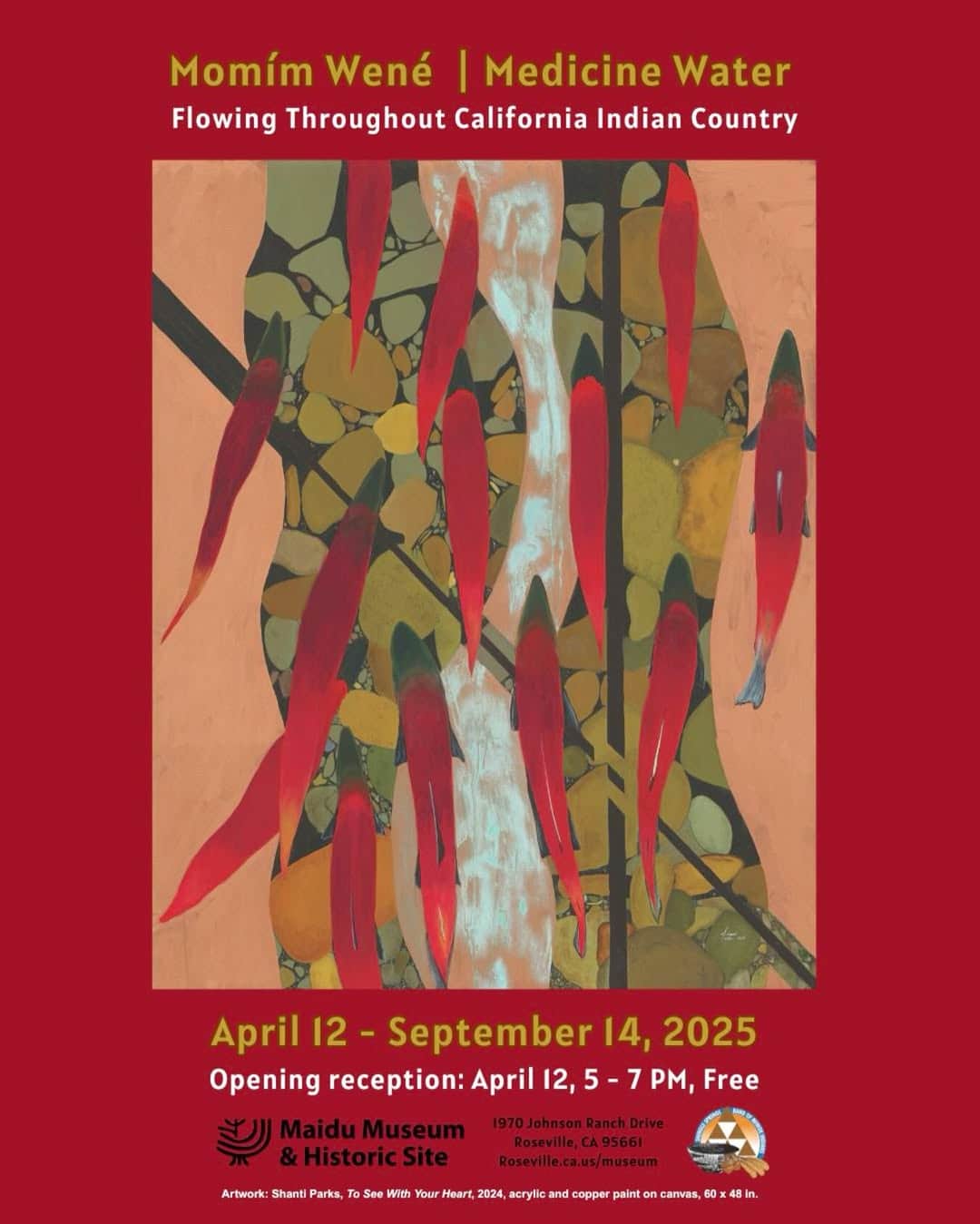 The Maidu Museum & Historic Site (MMHS) is thrilled to announce the opening of Momím Wené | Medicine Water: Flowing Throughout California Indian Country a contemporary art exhibition featuring 29 regional Native American artists. The exhibition will open with a reception on Saturday, April 12 from 5:00 – 7:00pm; admission is free.
