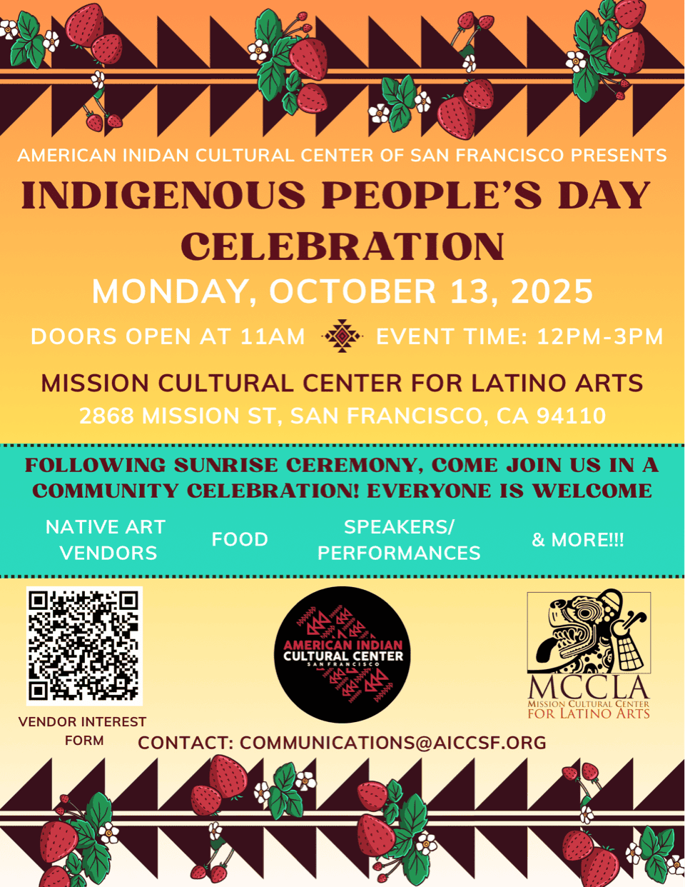 The American Indian Cultural Center of San Francisco is hosting a celebration in honor of Indigenous People’s Day. The event is set to feature Native art vendors, food, as well as speakers and performances.