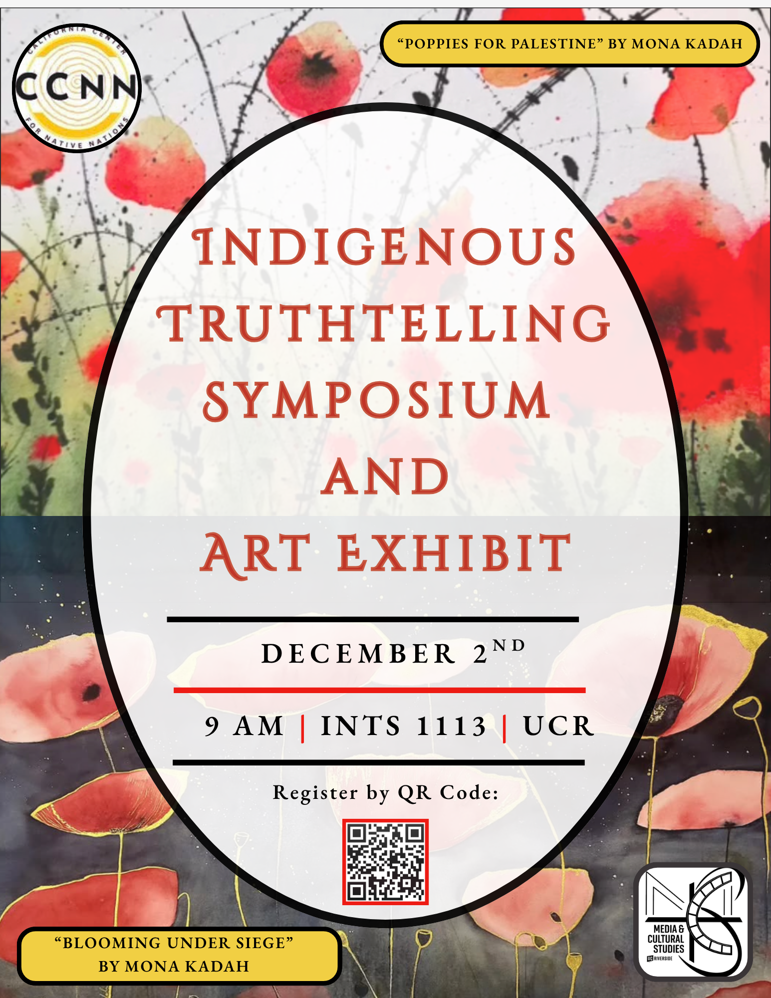 The California Center for Native Nations (CCNN), in collaboration with the Department of Media and Cultural Studies (MCS), invites you to the Indigenous Truthtelling Symposium & Art Exhibit. This one-day gathering honors artists, poets, writers, scholars, and journalists who dedicate their lives to truth-telling in the face of ongoing violence. The exhibit features an original installation by CCNN artist-in-residence Weshoyot Alvitre, a Tongva-Scottish artist whose work reflects Indigenous legacies of resistance to displacement and erasure, alongside mosaic portraits and sculptures honoring truth-tellers such as Bisan Owda, Shireen Abu Akleh, and Dr. Refaat Alareer, whose poem “If I Must Die” will appear in multiple languages.