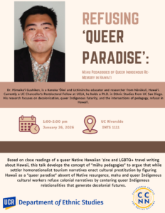 Based on close readings of a queer Native Hawaiian ‘zine and LGBTQ+ travel writing about Hawai’i, this talk develops the concept of “mãhu pedagogies to argue that while settler homonationalist tourism narratives enact cultural prostitution by figuring Hawai’i as a “queer paradise” absent of Native resurgence, mahu and queer Indigenous cultural workers refuse colonial narratives by centering queer indigenous relationalities that generate decolonial futures.